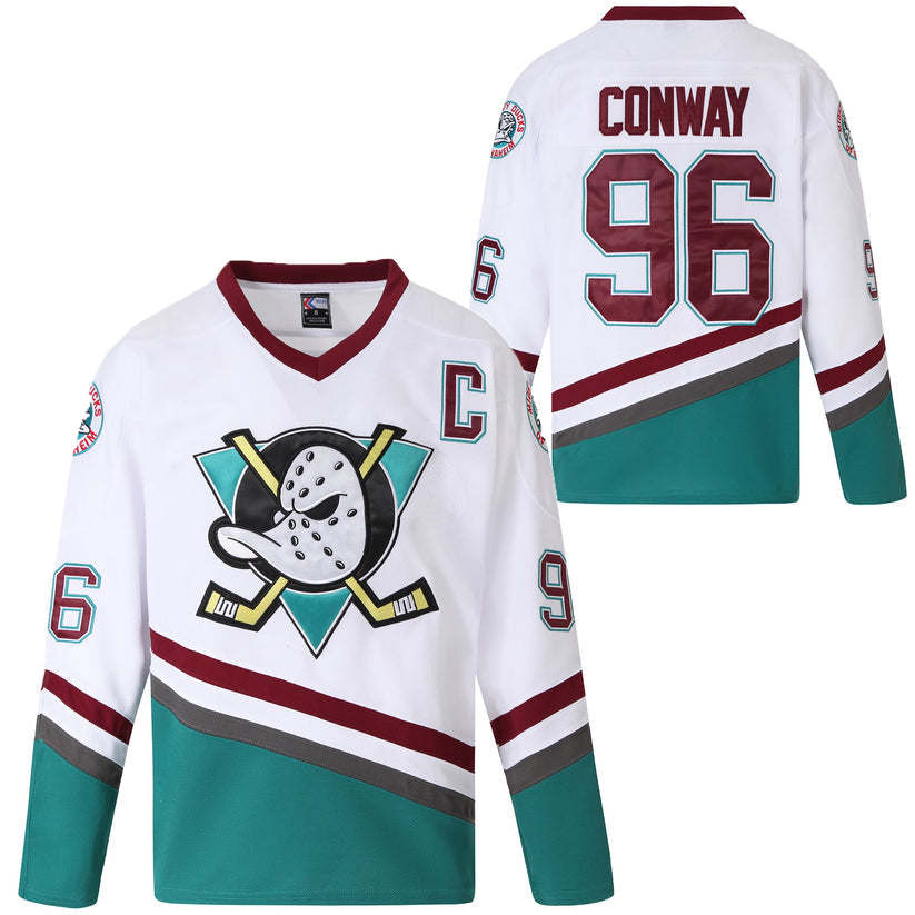 Youth Mighty Ducks Jersey is from the kid's ice hockey movie D1: The Mighty Ducks. The main color of the jersey is green. The number of the jersey is #96. And the name and numbers fo the jersey are all stitched.